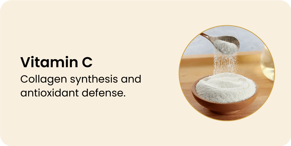 - فيتامين C: تركيب الكولاجين والدفاع المضاد للأكسدة .