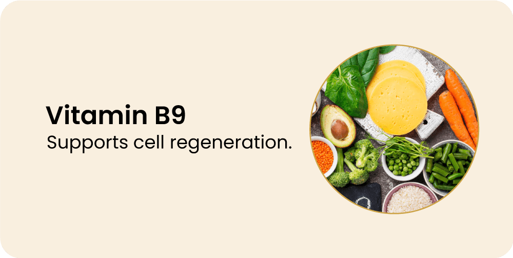 - فيتامين B9: يدعم تجديد الخلايا.